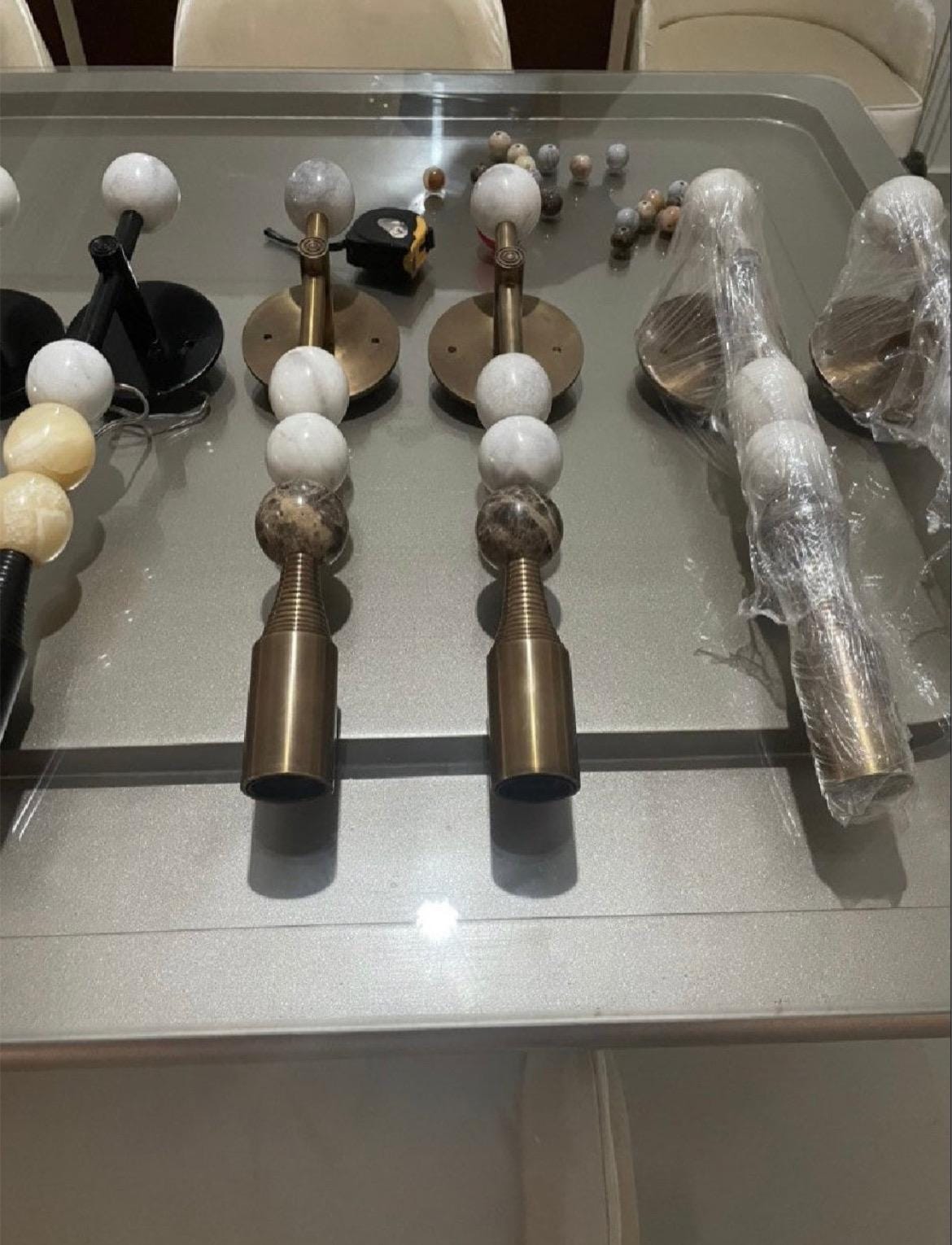 • Material: Natural marble spheres, genuine leather wrap, brushed metal hardware, and frosted glass shade