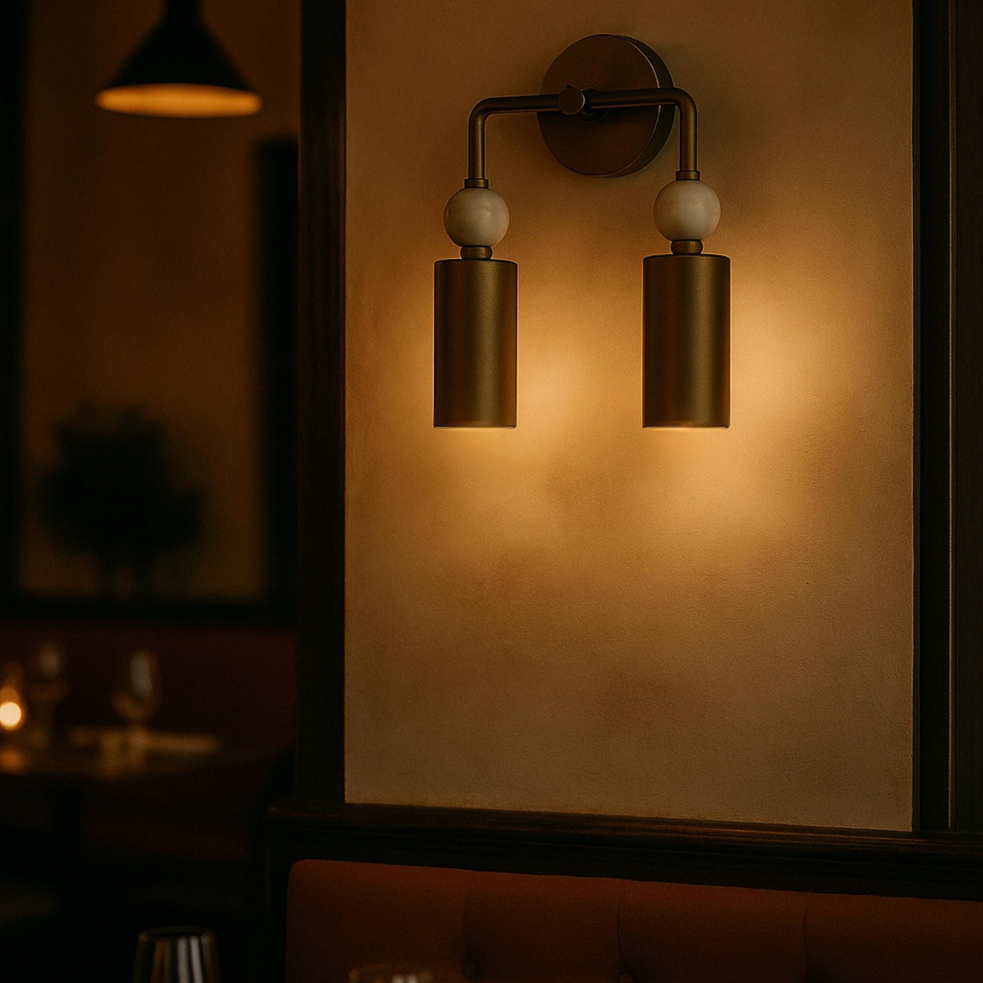 Bring timeless elegance and sculptural beauty to your interior with our modern double wall sconce, handcrafted from rich brushed brass and accented with luxurious white marble spheres. The cylindrical lights are gracefully suspended from a symmetrical arm, creating a bold yet refined focal point in any room.