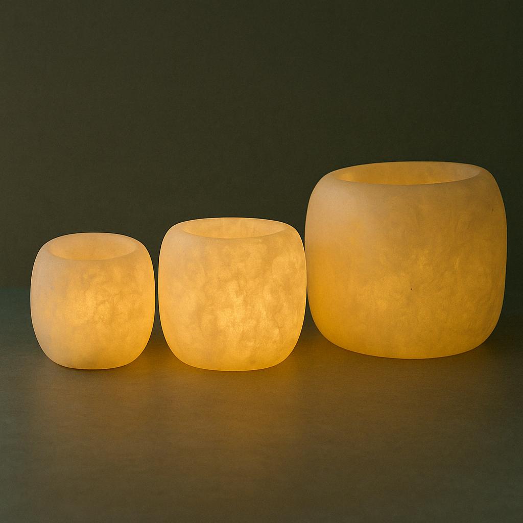 Create a calming and elegant ambiance with our handmade alabaster candle holders, crafted from 100% natural alabaster stone. These luxurious tea light holders emit a soft, warm glow—perfect for relaxing spaces like spa rooms, saunas, bedrooms, or living rooms.